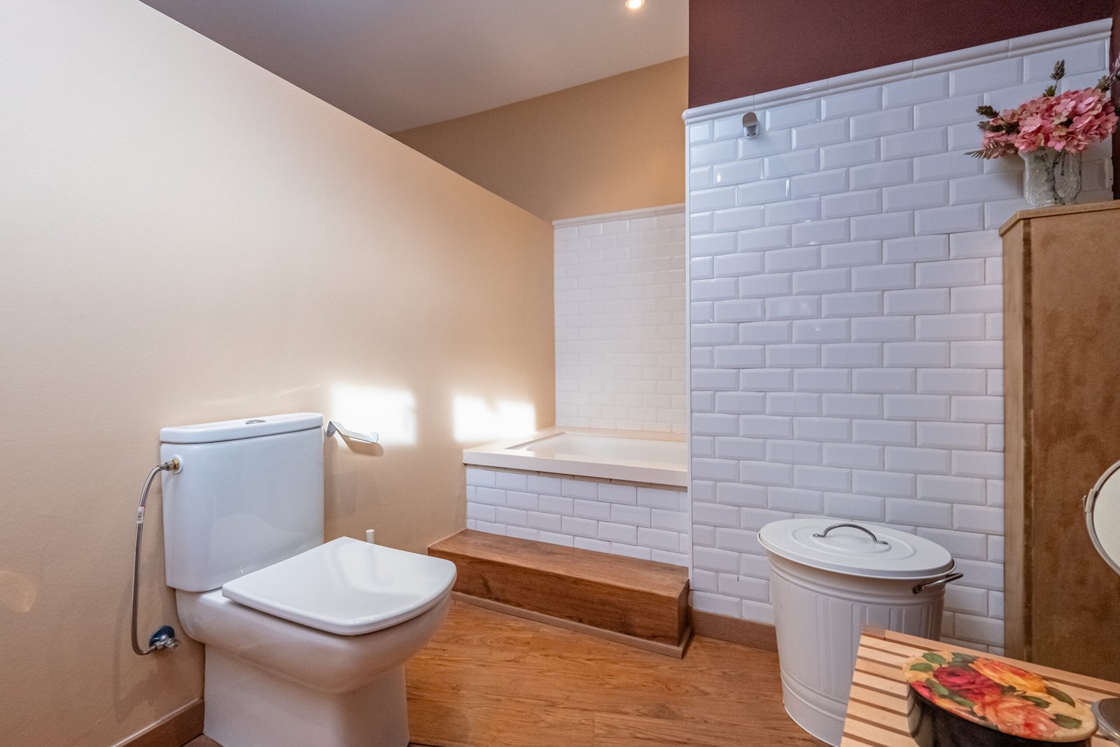 Apartament independent amb saló-menjador, cuina oberta amb sortida al porxo i jardí, una habitació doble amb vestidor ampli i un bany complet amb banyera.